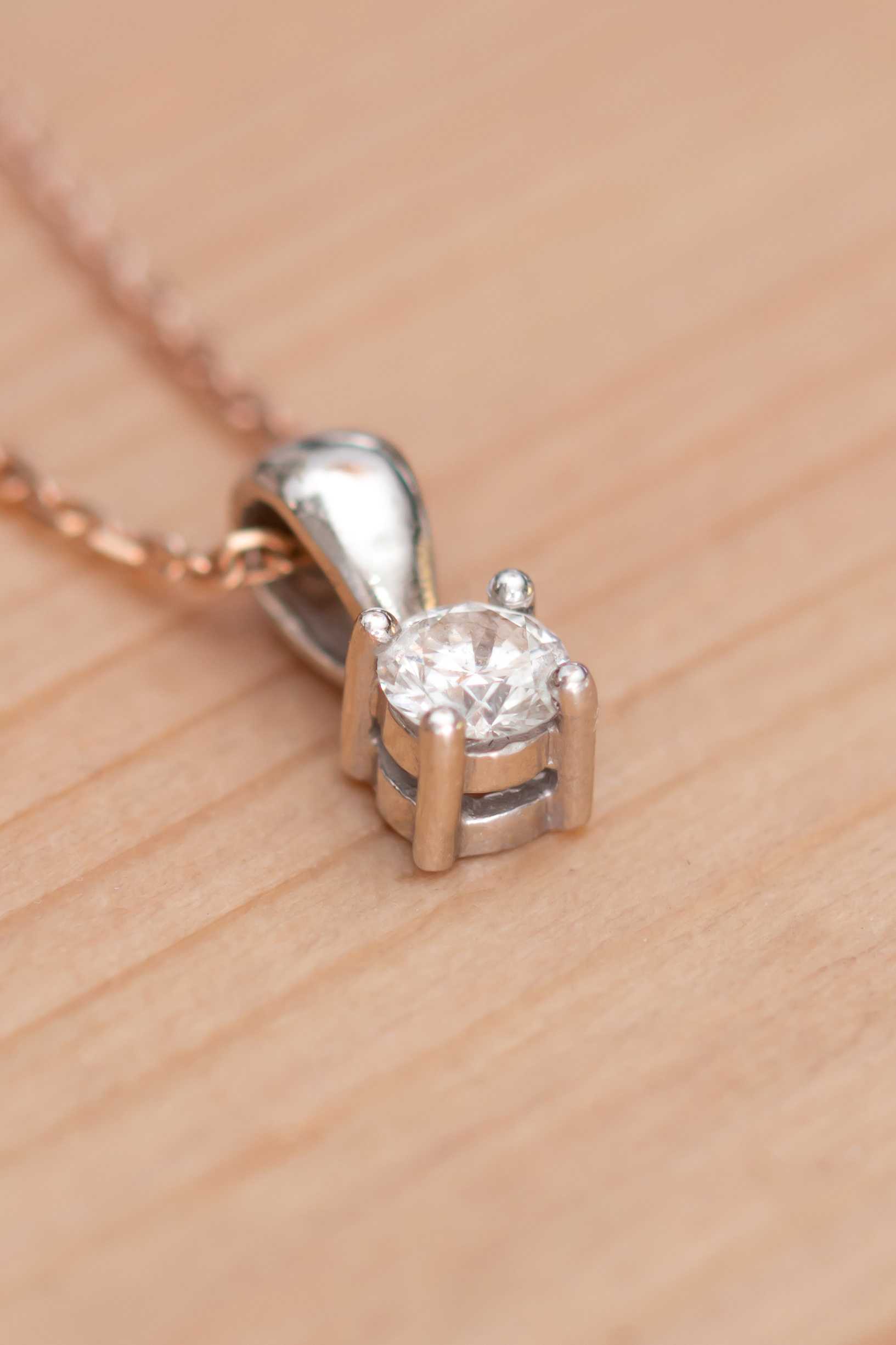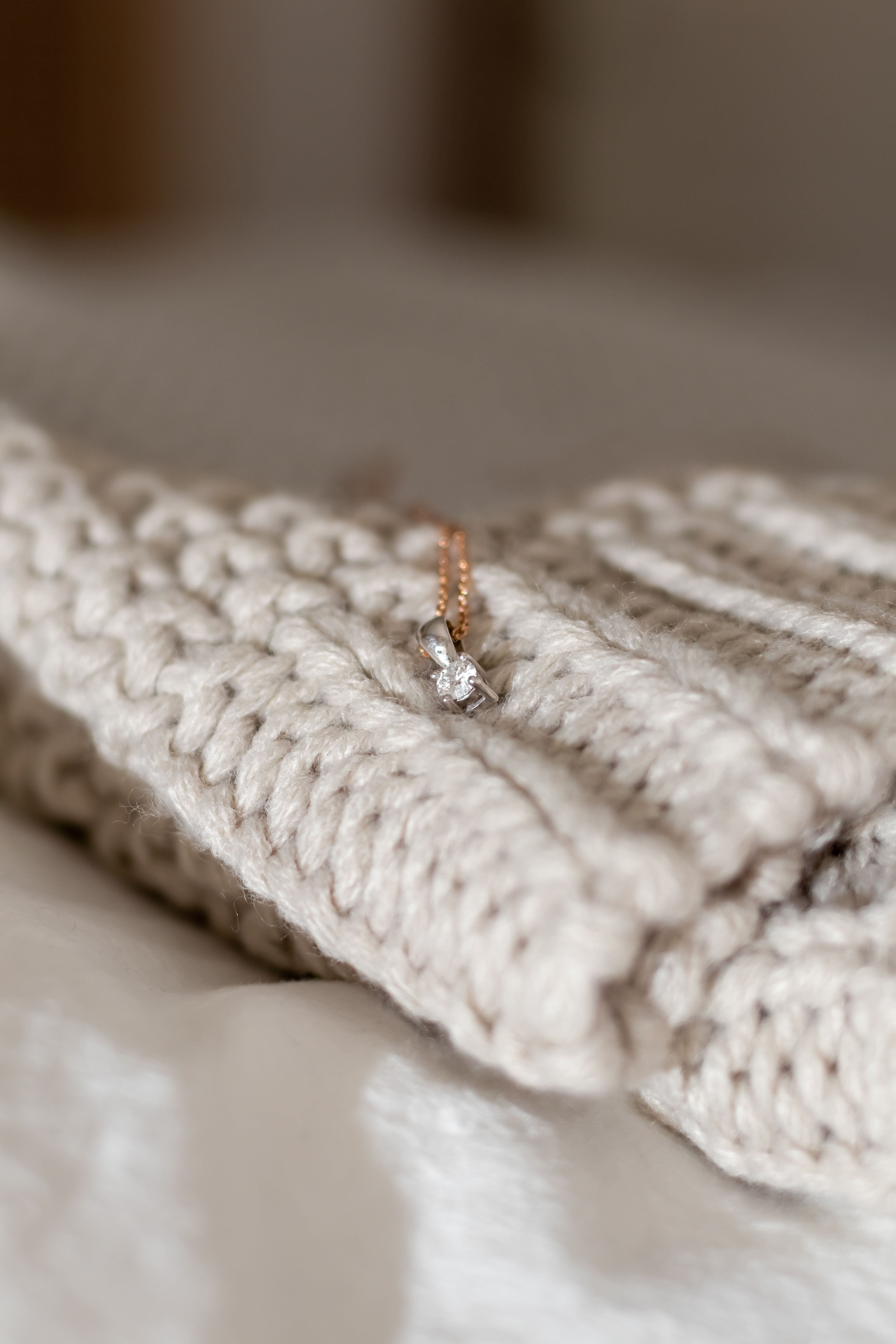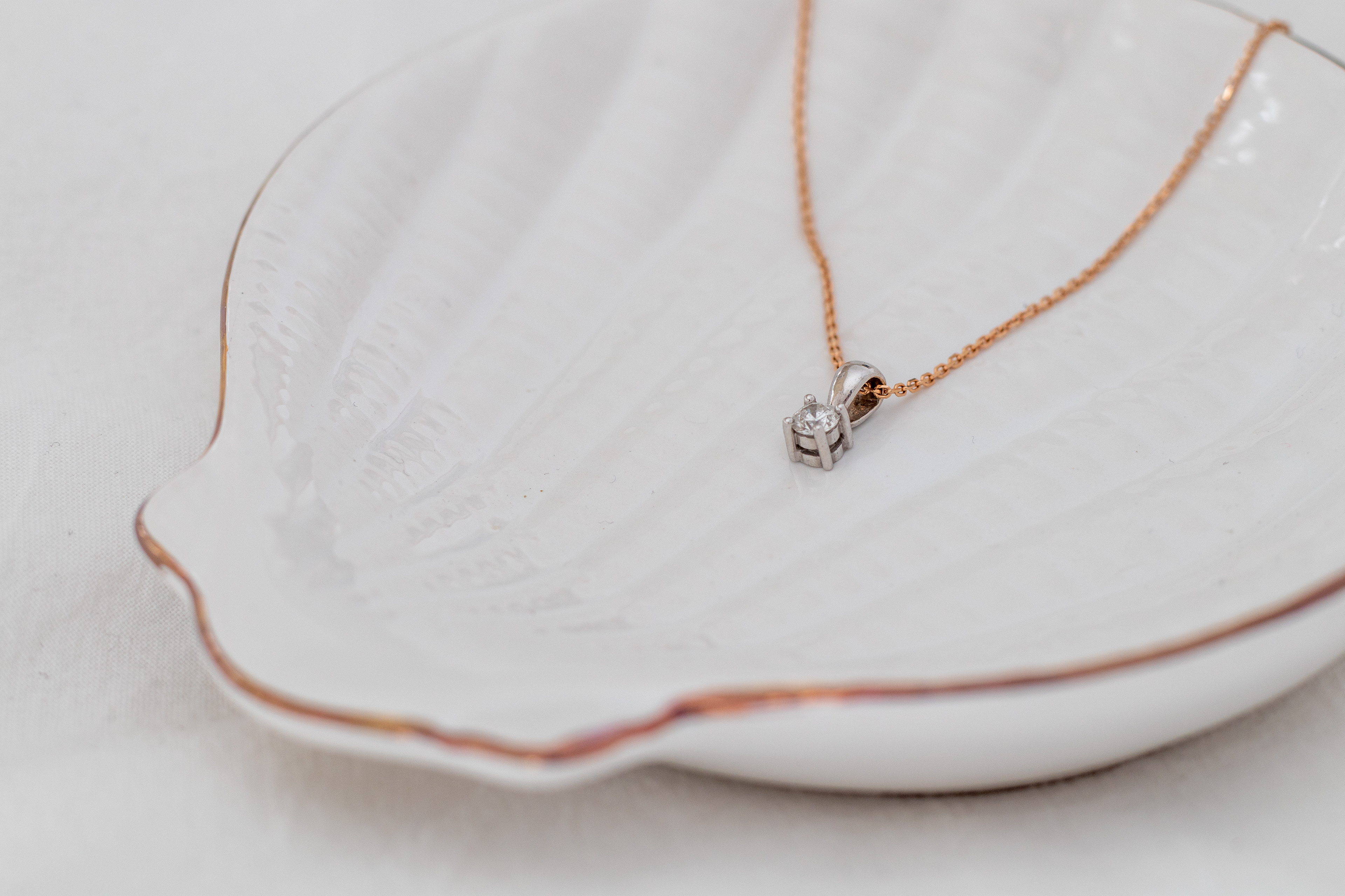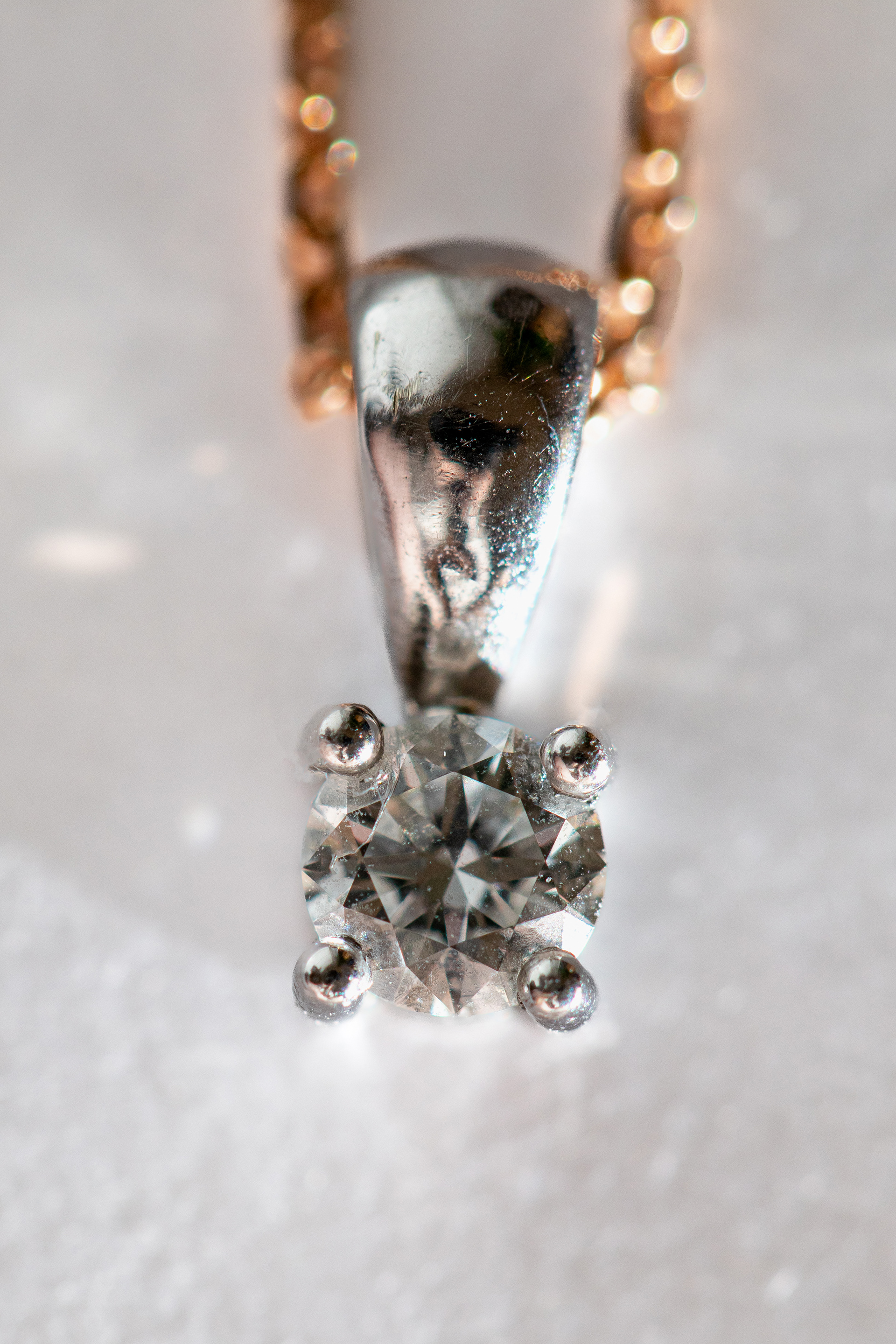 A collection of on-location product photographs of a simple, well-loved, diamond and gold necklace.