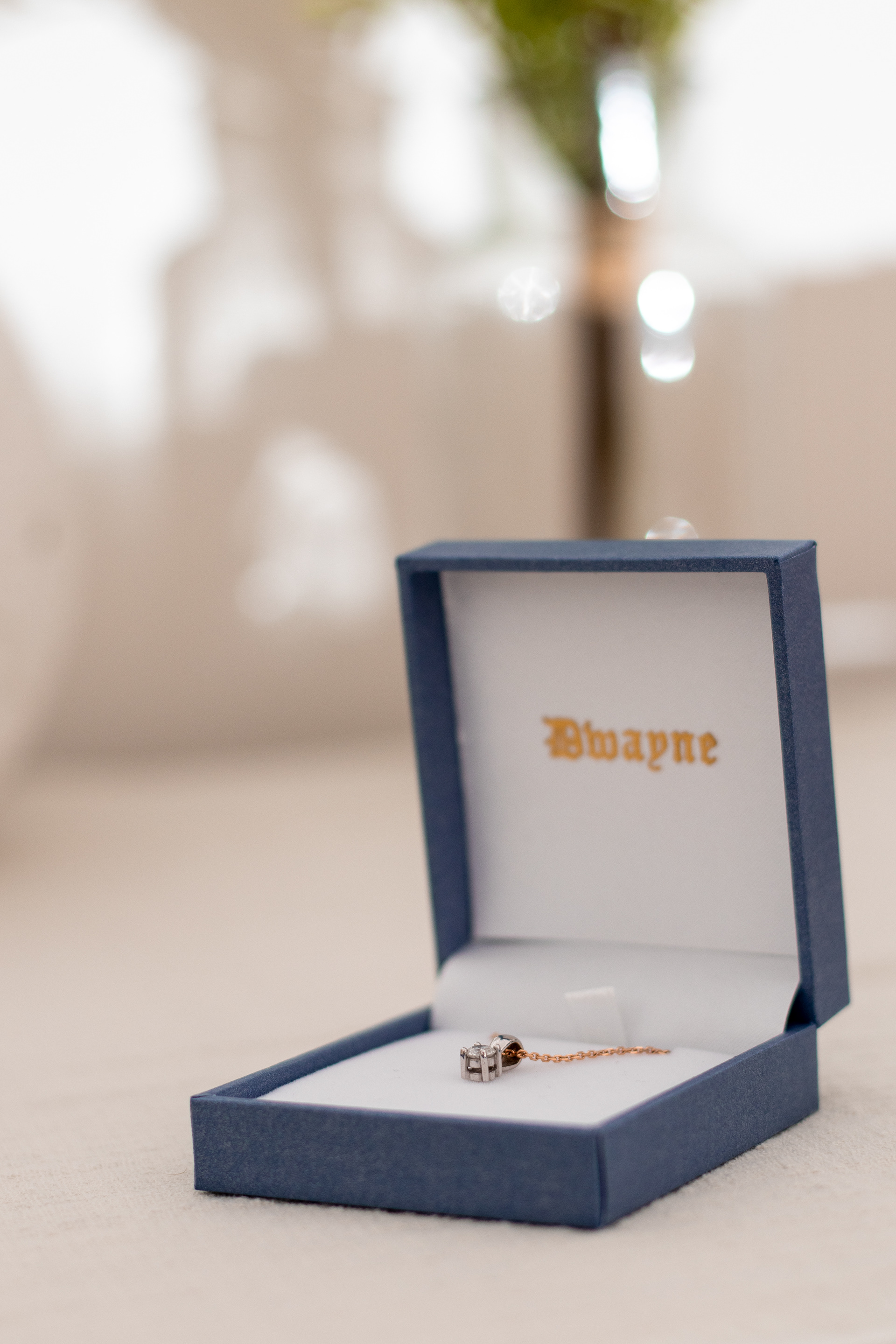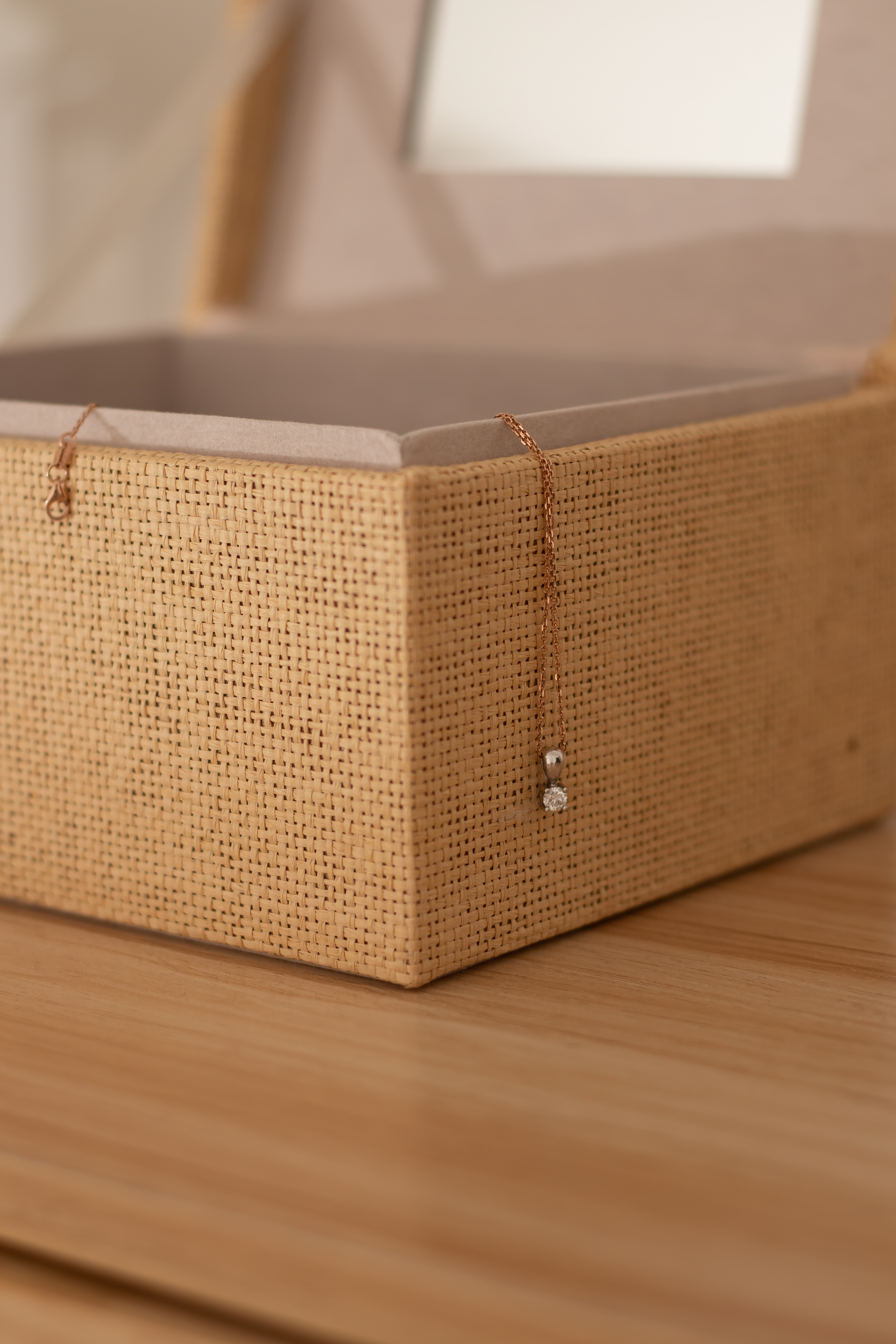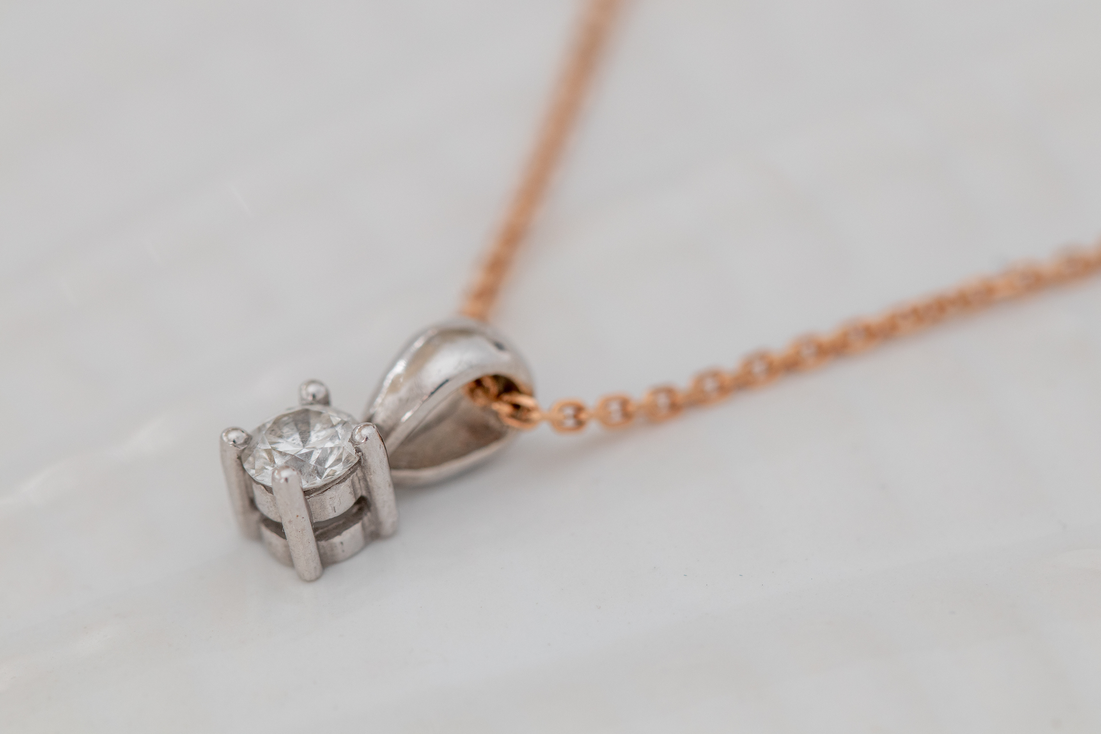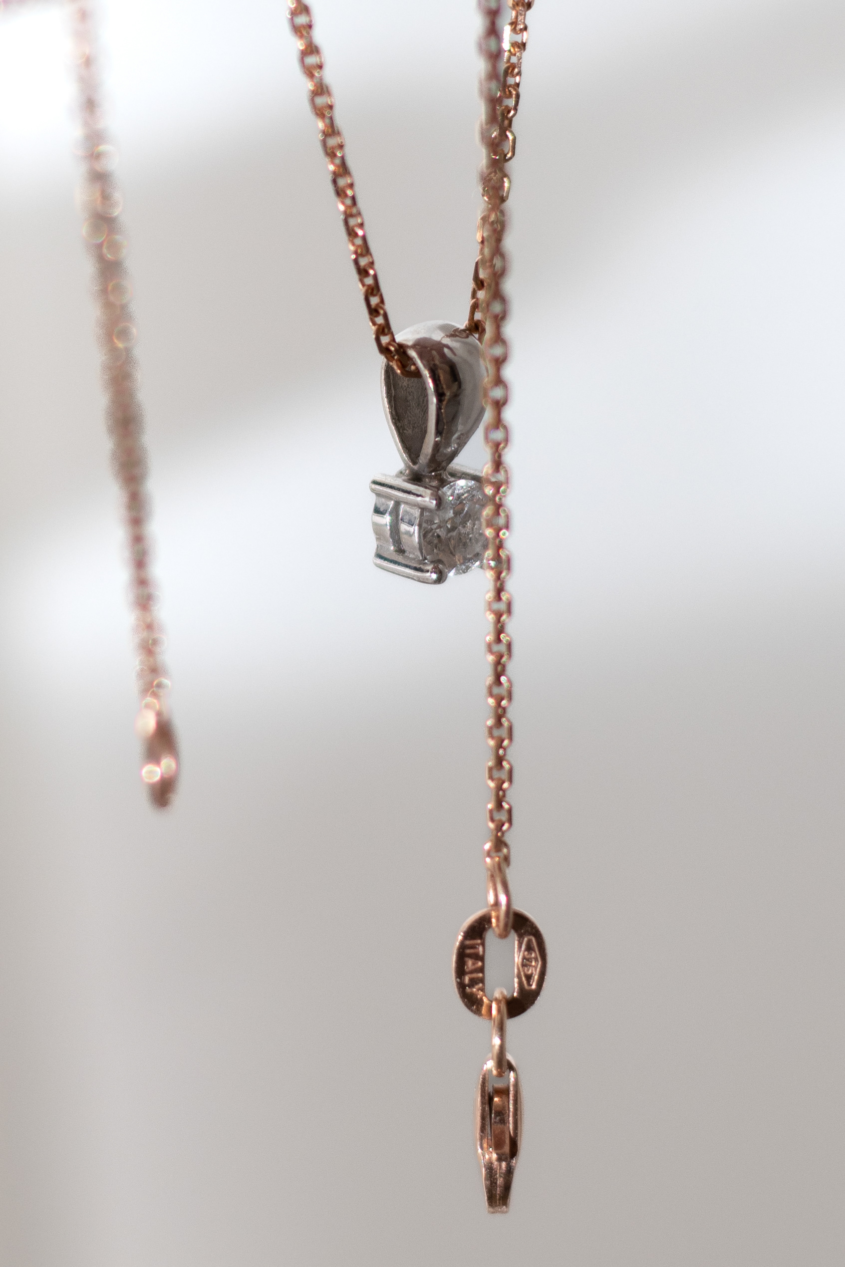 A collection of on-location product photographs of a simple, well-loved, diamond and gold necklace.
