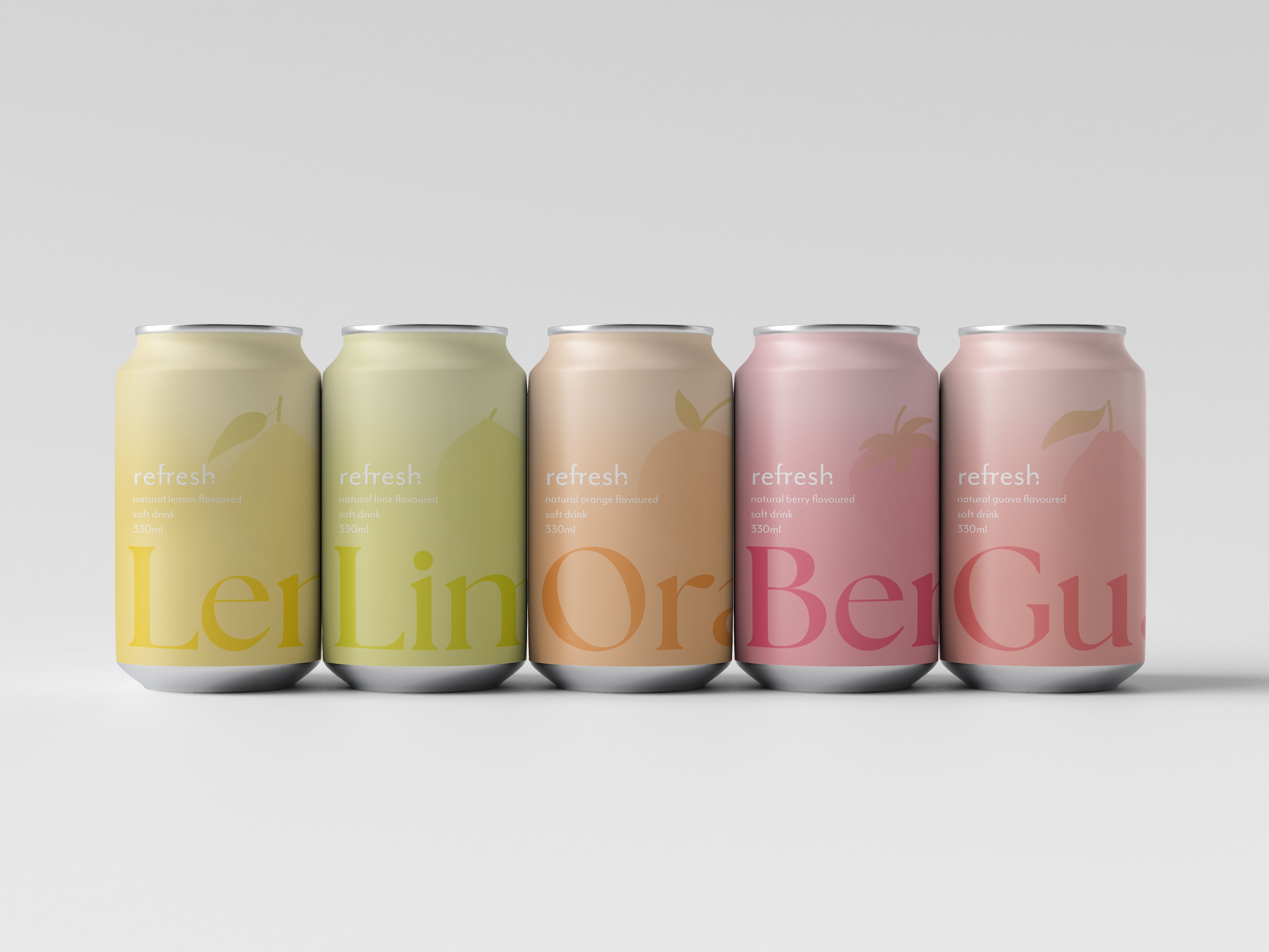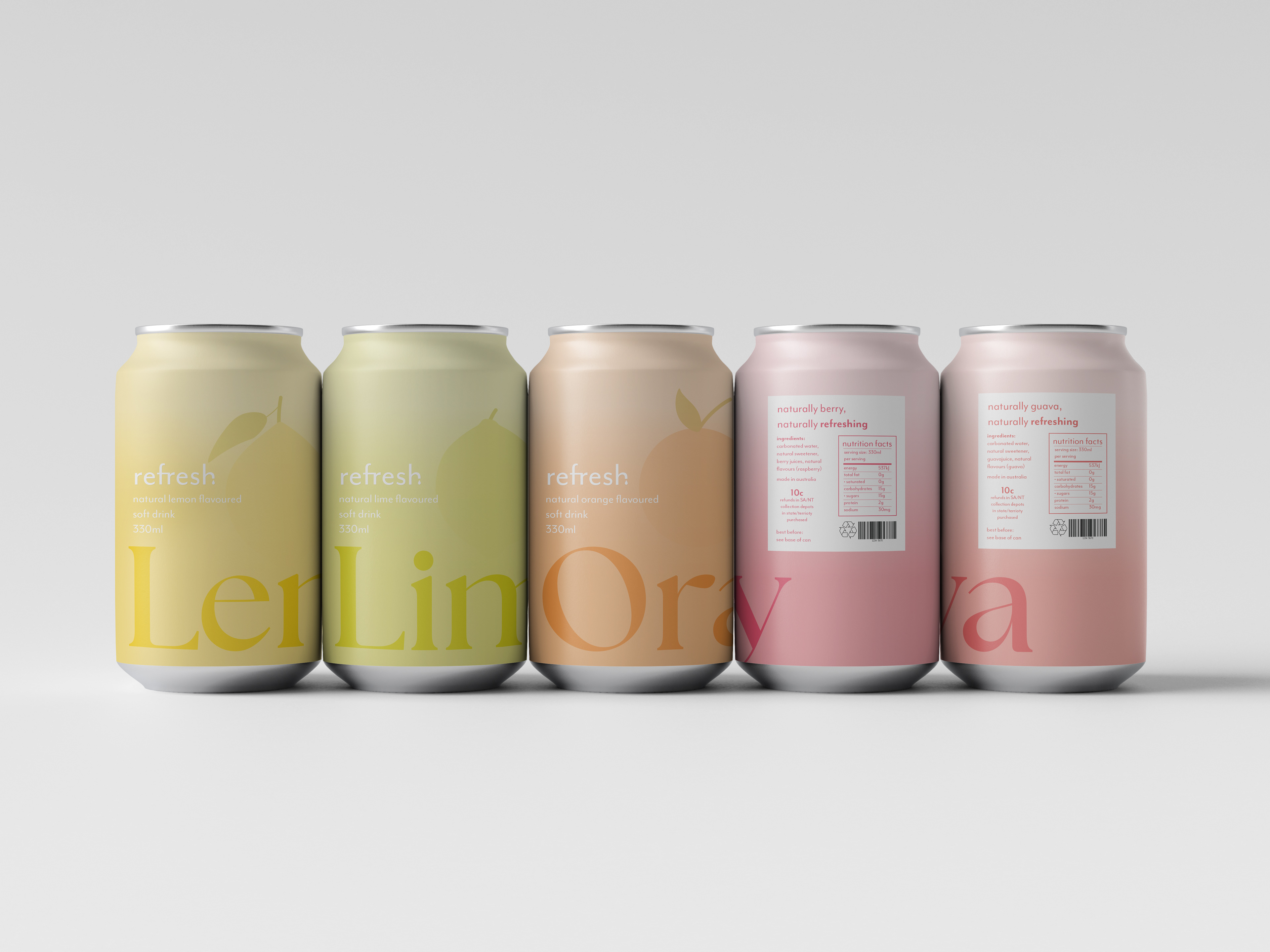A series of cohesive packaging designs for a natural, fruity soft drink company.